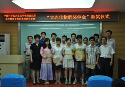 华中科技大学化学化工学院的颁奖仪式由副院长李涛教授主持,院长解孝林和熊博晖分别致辞?;锌萍即笱ЩЩぱг汗灿?0名优秀本科生获得2011-2012年度“大连化物所奖学金”,获奖名单如下:周晓琳、刘妍、蔡明乐、张超、蓝欢、周笛、王硕、徐少怡、林锦池、陈满堂。