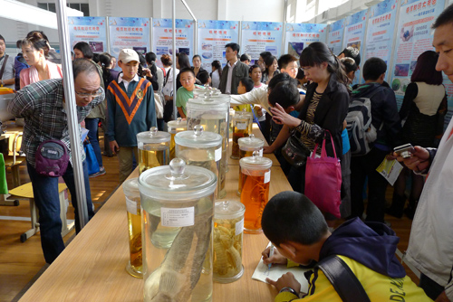 海洋知识展区内,前来参观的市民络绎不绝,许多中小学生拿着海洋知识竞赛答题在展板前寻找答案,并不时向志愿者询问。各式的海洋生物标本吸引了许多参观者的目光,志愿者耐心的为同学们讲解标本的产地、学名、习性和制作保存方法等知识。海洋微观世界——有孔虫展架前,参观者对有孔虫的千姿百态、美轮美奂赞不绝口。