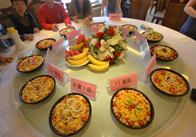 本次活动分为PIZZA制作和水果拼盘两个环节。在PIZZA制作过程中,必胜客的pizza培训师现场详细讲解了制作过程。然后大家用统一分发的面饼及各组所要求的食材,精心设计制作出了自己的pizza。大家就各自pizza的设计寓意向评委老师做了讲解,随后经过20分钟的烘烤,香喷喷的pizza出炉,评委老师进行逐一品尝后打分。在水果拼盘环节,大家用西瓜、香蕉、芒果等水果,通过精心的设计,或是雕琢成小动物样、或是拼合为齐心合力状,各形各状,无不体现着参赛者绝佳的创造力和想象力。与PIZZA制作和水果拼盘同时进行的还有经典的包粽子活动,让大家亲身体验了包粽子的乐趣。同时,还有苹果乐园、快手剥花生等小游戏也得到了大家的积极参与。