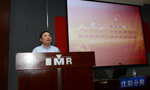 为庆祝建党94周年,深入开展“三严三实”专题教育,7月1日,沈阳分院党组以视频会议的方式举办了“庆祝建党94周年党课报告暨‘三严三实’专题教育培训”?;嵋橐越鹗羲骰岢。直鹪诖罅?、青岛和烟台的各研究所设立分会场,沈阳分院系统各单位党委委员、副处级以上领导干部、党支部书记等人员共计400多人参加了会议?;嵋檠朐屑臀ぶ锌圃杭图熳樽槌ね跬ゴ笸咀髯ㄌ獗ǜ?,沈阳分院党组书记、副院长王启尧主持了会议。