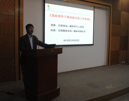 纪委书记郭秀银以“筑牢思想防线, 落实‘两个责任’”为题,介绍了院党组、组局有关反腐倡廉建设要求,院及分院反腐倡廉形势与存在的问题,最后向新任干部提出要肩负起党风廉政建设责任的具体要求。