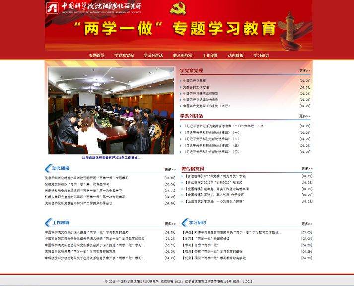 所网站开设了“两学一做”专栏,并放置在网站醒目位置。专栏内容丰富翔实,为党员进一步深入学习“两学一做”提供便捷渠道。党员可以通过专栏查看党章党规具体内容,与习近平同志系列讲话特别是其关于科技创新的论述内容,以及“两学一做”学习教育实施方案与相关通知;专栏及时更新研究所与各支部“两学一做”学习动态新闻;提供“两学一做”相关知识内容与评论文章供党员同志延伸学习;推出“身边榜样”与“全国楷?!笔录N吃笔髁⒀鞍裱?。