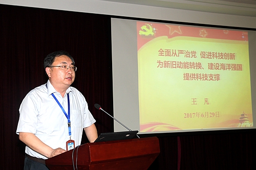 党委委员、所长王凡同志作了题为《全面从严治党,促进科技创新,为新旧动能转换、建设海洋强国提供科技支撑》的党风廉政主题报告。他指出,目前反腐败形势依然严峻复杂,广大党员要严明党的纪律和规矩,把纪律挺在前面,绝不碰触党纪国法高压线;他还传达了白春礼院长在2017年院党建暨党风廉政建设工作会议上的讲话精神以及山东省第十一次党代会精神,并从海洋所与烟台海岸带所两所融合的实际工作出发,阐述了研究所发展的新举措、新战略、新政策和新导向,“志和者,不以山海为远”,他希望大家能以更大的决心、气力和勇气深入推进全面从严治党向纵深发展,以优异成绩实现研究所创新跨越发展。