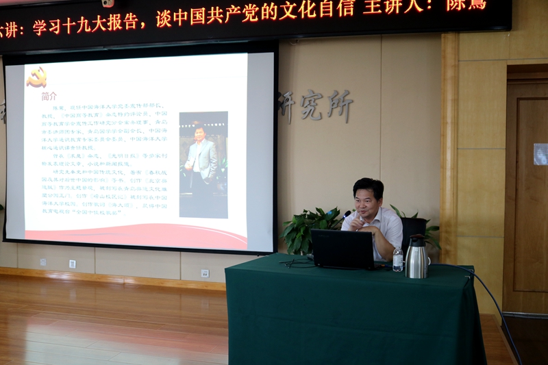 9月26日下午,中国海洋大学党委宣传部部长陈鷟教授应邀再次作客中国科学院青岛生物能源与过程研究所“清源聚能”文化论坛,做了题为“学习十九大报告,谈中国共产党的文化自信”的精彩报告。研究所全体党员、入党积极分子共200余人到场聆听了报告。 陈鷟深入阐释了十九大报告中文化自信的丰富内涵,从中国共产党的文化根基、中国历史和传统文化等方面分析了“坚定文化自信 弘扬传统文化”的现实意义和重要性。