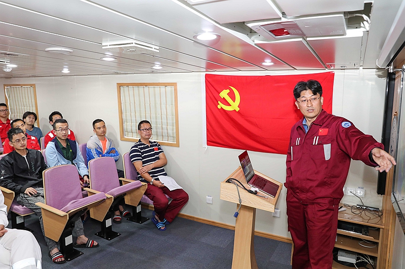 5月21日,正驶往马里亚纳海沟的“科学”号科考船上,“海上堡垒”临时党支部举行“海洋强国 筑梦深蓝”主题党日活动,临时党支部全体党员和部分科考队员等40多人参加活动。