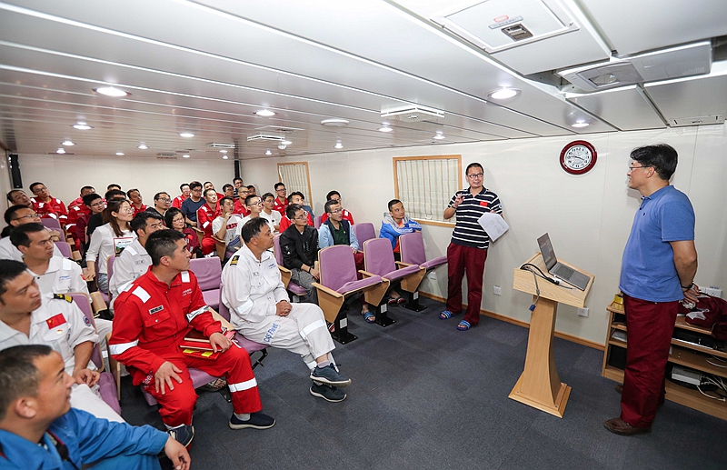 航次首席科学家、临时党支部书记徐奎栋研究员带领大家学习了习近平总书记关于建设海洋强国的系列重要论述,分析了当前我国在海洋领域面临的形势和挑战,号召全体党员群众在海洋科研工作中不畏艰难敢于拼搏,为加快建设海洋强国、实现伟大复兴的中国梦努力奋斗贡献力量。同时,结合“生物多样性国际日”和航次科学考察任务,徐奎栋研究员作题为“印太海洋生物多样性的过去、现在和未来”的学术报告,介绍了形成印太珊瑚礁大三角这一全球海洋生物多样性最高区域的种种科学假说及其驱动因素。