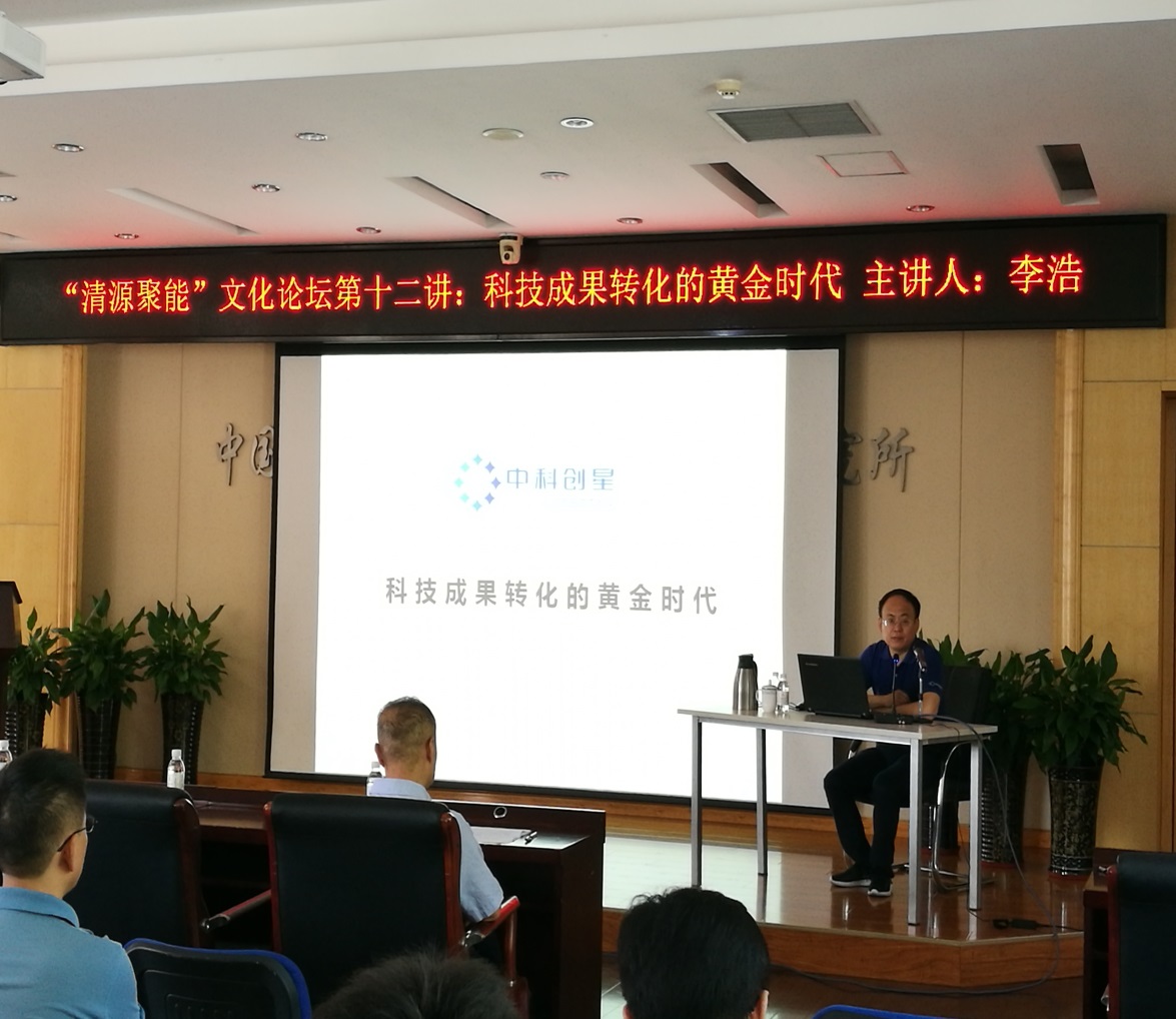 为充分发挥市场机制引导作用,加快科技成果市场化,建立产权明晰的管理体制,搭建研究所、投资基金、孵化器为一体的科技创业体系,6月24日,特邀西安中科创星科技孵化器有限公司创始合伙人、联席CEO李浩做客研究所“清源聚能”文化论坛,讲授科技成果产业化模式和投资经验。知识产权与成果转化处、育成中心、部分研究组等工作人员参加会议,研究所党委副书记、纪委书记冯埃生主持会议。