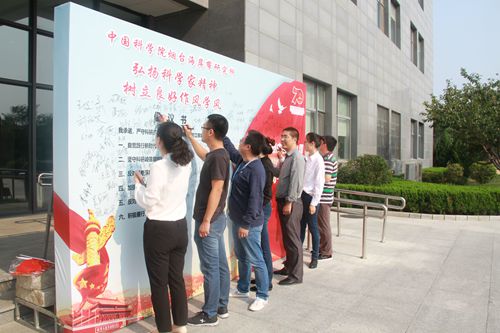 9月27-30日,在祖国70年华诞来临之际,为大力弘扬科学家精神,教育和引导科研人员树立良好作风学风,中国科学院烟台海岸带研究所党政领导班子成员、职工、研究生近200人郑重签名,承诺“弘扬科学家精神、树立良好作风学风”,表达了作为科技工作者坚定科技报国的决心和信念,并向祖国献上祝福。
