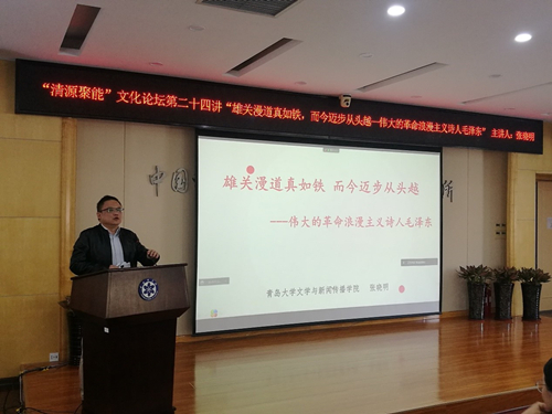 张晓明从“毛泽东诗词研究现状”“毛泽东诗词与中国共产党党史”和“毛泽东诗词革命浪漫主义探微”三个方面深入浅出的展开讲解,表示在中国共产党领导的革命斗争和社会主义建设时期,优秀的革命者、建设者们常以笔为犁,以梦为马,用革命的诗词记录着伟大的理想信念、革命实践与战斗情怀,表现出昂扬的浪漫主义激情和英雄主义气概,毛泽东诗词就是其中的杰出代表。