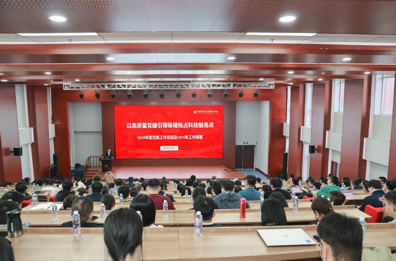 党委书记兼副所长孙雷作《以高质量党建引领保障抢占科技制高点——2024年度党委工作总结及2025年工作部署》报告。他从强化政治建设,加强党对科技工作的全面领导;加强思想引领,为抢占科技制高点凝聚共识;夯实基层基础,增强党组织政治功能和组织功能;加强人才队伍建设,激发科技创新活力;加强纪律建设,深入推进全面从严治党;突出政治引领,加强统战、群团和离退休工作等6个方面回顾了所党委2024年度工作。
