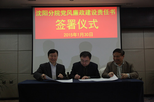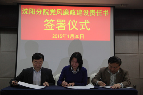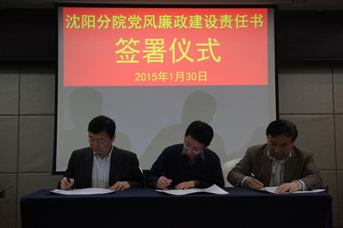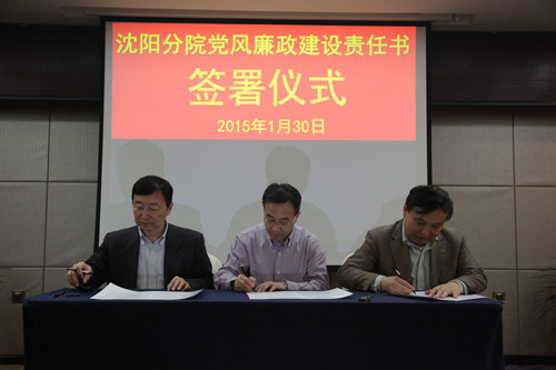 2015年1月30日,沈阳分院组织与系统各研究所签订党风廉政建设责任书。受院党组委托沈阳分院院长韩恩厚、党组书记王启尧与各研究所所长、党委书记分别签订了个性化反腐倡廉建设责任书、党风廉政建设责任书,同时与分院领导班子其他两位成员也签订了个性化责任书。沈阳分院党组副书记、纪检组长徐岩主持责任书签订仪式。