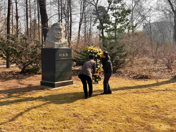 党委书记、副所长金昌杰和标本馆馆长袁海生研究员向刘慎谔先生雕像敬献花篮