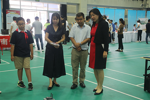在浑南区中小学校科技教育成果展中,浑南区各中小学代表展示了暑期科技实践成果,马越红与郑向东一同听取了学生代表的讲解并向同学们表达了鼓励和肯定。