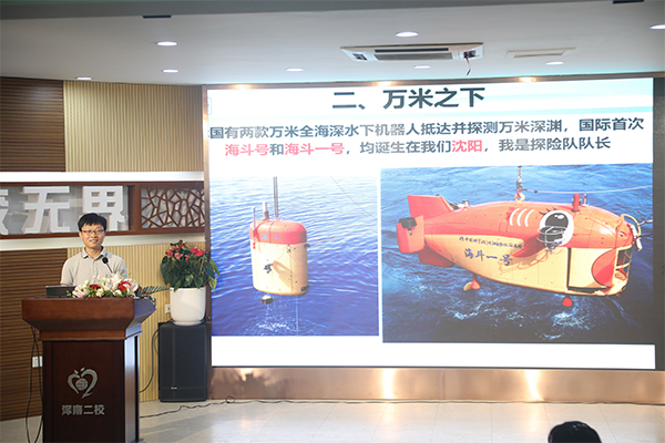“科学家进校园”活动中,唐元贵作了题为“以科技力量探索万米神秘海洋”的科普报告,通过讲解、视频、图片等方式为同学们生动全面地讲解了“海斗号”与“海斗一号”万米深潜的过程,揭开万米海底的神秘面纱。通过唐元贵的讲解,极大地激发了同学们对探索科学的兴趣,树立了榜样,并让同学们深刻体会到了科学家科技报国、勇于担当的精神。
