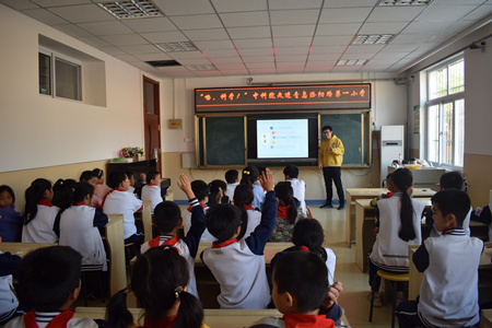 首场活动走进洛阳路第一小学,仿生智能材料研究组博士研究生李现凯以“神奇的液态金属”为题,为学生们做了一场有趣的科普报告。报告深入浅出的讲解了液态金属的用途,利用视频动画的方式介绍了液态金属的“吃喝玩乐”以及科研人员是如何研究液态金属。报告的最后鼓励学生们要留心生活中的各种现象,多多开动脑筋,你也可以成为伟大的科学家,做一个对社会有贡献的人。