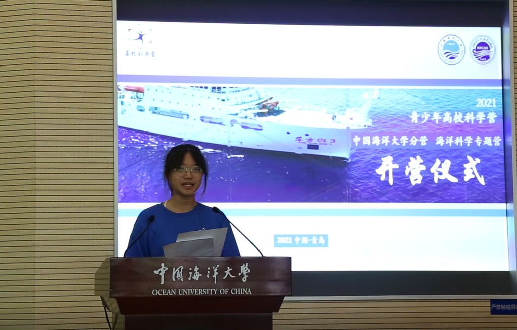 来自山东省威海市实验高级中学的宫俨凌同学作为营员代表发言。她在发言中表达了对活动组织方的衷心感谢,表示期待通过此次科学营更好地了解大学历史文化,知晓前沿海洋科技,锻炼实践能力。