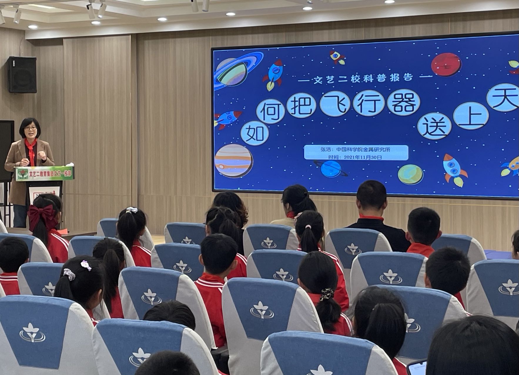 11月30日,中国科学院金属研究所研究员,博士生导师,陶瓷及复合材料研究部副主任张洁为同学们带来《如何把飞行器送上天》的科普报告。她以生活中常见的风筝为例,由浅入深地介绍了飞行物、飞行器,以及航空器和航天器的区别和飞行原理。并通过引导同学们现场做实验来启发他们对飞行物运动轨迹的思考,从而提炼出其中蕴含的科学道理,为青少年种下航天梦的种子。她还激励同学们努力学习,未来积极投身祖国航空航天事业的发展。