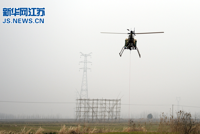 新华网南京1月16日电 当日,江苏盐城供电公司首次采用无人直升机架设输电线路。据了解,本次架线需要跨越道路、河流和大片树林,施工难度较大,采用传统的人工牵引步行方式放线需一个星期,而使用无人直升机放线方式仅需1天即可完成。同时,直升机放线对环境影响小,避免了对农田青苗和树林的破坏。(顾锋明 摄)