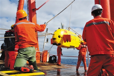 科考船“向阳红10号”上,作业组多人从各个方向拉起“潜龙二号”,准备入水。当地时间2月14日,西南印度洋,1.5吨重的“潜龙二号”下水开始进行一天多的勘测。此次的勘探目标是西南印度洋一块30多平方公里热液区的海底,机器人将沿着线路在海底来回横扫,其携带的各种传感器将采集各类信息。2月15日晚,完成任务浮出水面的“潜龙二号”被回收。从初步数据分析情况看,探测数据都被导出且基本有效,这意味着“潜龙二号”的首次试验性应用任务成功完成。新京报特派记者 金煜 摄