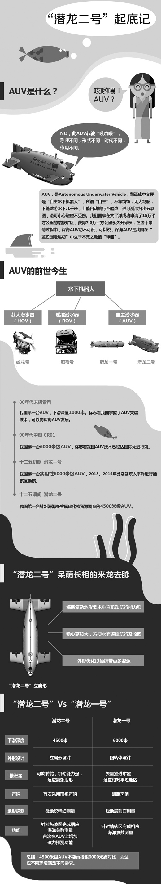 这不是一条普通的鱼,它的全名叫4500米级深海资源自主勘查系统“潜龙二号”,这是我国首台自主研发的4500米级自主水下机器人。这些天,在国际海底管理局与我国签订的多金属硫化物勘探合同区——西南印度洋一片热液区的海底,它按照预先设计的路线,首次坚持了整整30个小时的全航程探测,首次探测了海底山脉(即洋中脊)热液区,并获得了精细的三维地形地貌数据和300多张高分辨率连续照片……实现了中国深海科考的多个“首次”。