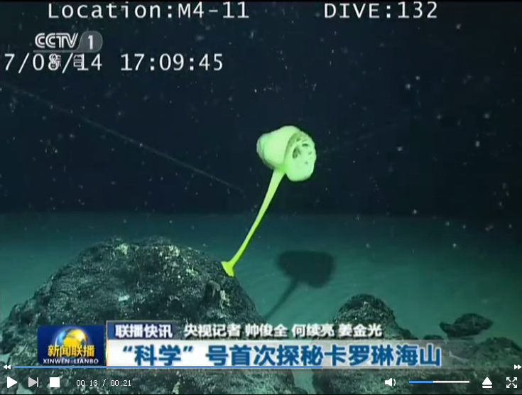 正在执行中科院海洋先导专项的新一代海洋科学综合考察船“科学”号近日在西太平洋卡罗琳海山进行了首次下潜作业,通过搭载的“发现”号潜器采集到一株约80厘米高的淡黄色海绵、一株稀有的偕老同穴海绵等。这也是人类首次对卡罗琳海山进行科学考察。