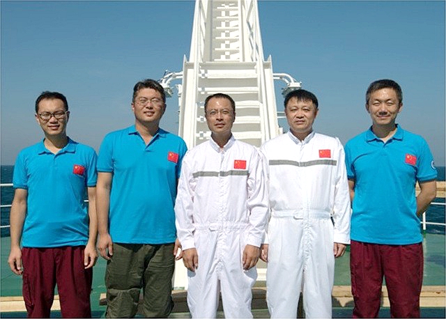 (左起:社员张健副研究员,社员连超高级工程师,社海洋所副主委栾振东教授级高工,社员刘合义船长,社员王昊副研究员)