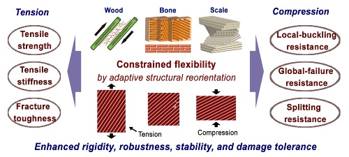 刘增乾研究团队在系统阐明天然生物材料梯度设计的形式、原则及其起到的作用与机制的基础上,首次提出了新型材料组织结构取向梯度的概念与设计原则,阐明了梯度结构取向与再取向对力学性能的优化机理,并且提炼了改善材料力学性能的仿生设计新思路,即通过控制微观组织结构取向实现材料的局域刚度、强度与韧性的优化分布与相互匹配,从而提高材料整体的力学性能。同时,该研究组首次发现,材料在加载过程中发生的组织结构再取向不仅可以提高其变形能力,更能够为实现综合力学性能的改善提供有效的途径,如图2所示。