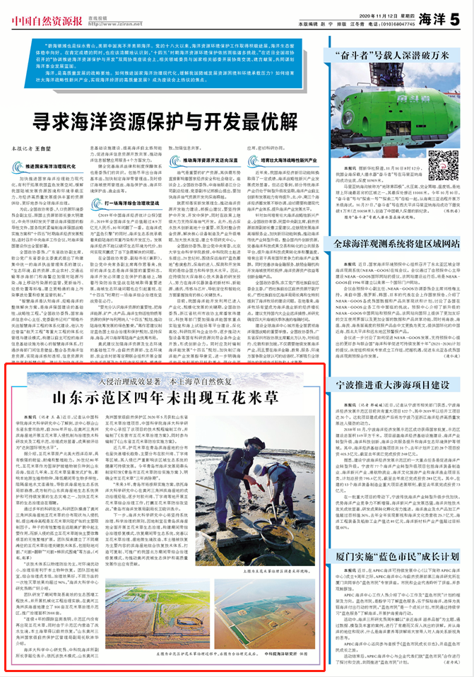 “该技术体系以物理防治为主,对环境扰动小,治理后有利于本土物种恢复。团队因地制宜,综合治理成本低,治理效果好,不同方法的一次性灭草效果均超过90%。”海洋大科学中心研究员韩广轩介绍。