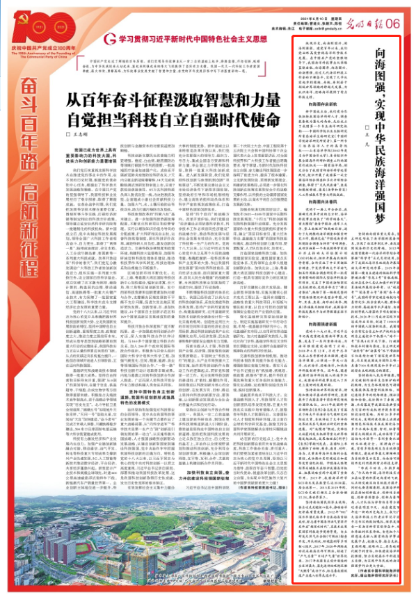 “昨夜斗回北,今朝岁起东。”今天的中国,海洋科技实力正在从量的积累迈向质的飞跃、从点的突破迈向系统能力提升,同时也要清醒看到,我国海洋科技在原始创新能力、创新体系效能、创新资源整合、创新力量布局、人才队伍与评价体系等方面还存在明显不足。站在建党百年这一新的历史起点上,我们广大海洋科技工作者应牢记习近平总书记的殷切嘱托,继承发扬老一辈海洋科学家艰苦奋斗、无私奉献的优良传统,自觉把个人理想追求融入国家的海洋事业发展中去,把握大势、抢占先机,直面问题、迎难而上,肩负起时代赋予的重任,加快建设海洋科技强国,努力实现高水平科技自立自强,为实现中华民族的海洋强国梦作出更大贡献。
