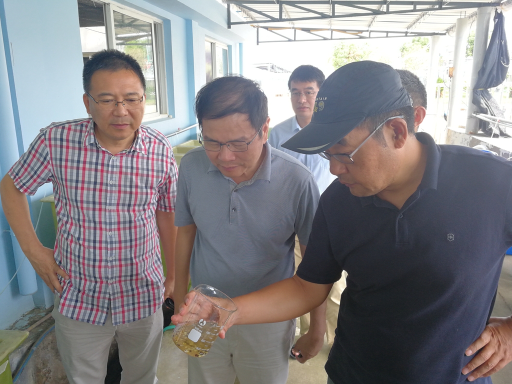 刘保忠(右一)向专家介绍文蛤新品种育苗情况。受访者供图