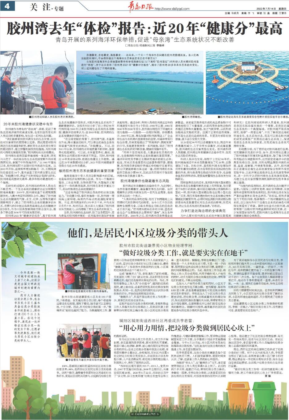 “与国内的海湾相比,胶州湾的生态问题并不显著;与国际上切萨皮克湾、纳拉甘西特湾、东京湾和布雷斯特湾等海湾相比,胶州湾也没有发生严重的富营养化等生态状况?!彼锼伤担艿蕉嘀匮沽ο碌慕褐萃?,能够维持一个相对健康的生态系统,这让国内外对于近海生态系统的绿色可持续发展看到了希望。期待全社会关注胶州湾,政府等部门加强对胶州湾监测和研究的支持,进一步发挥国家站作用,把胶州湾打造成维持生态系统健康发展的全球典范。