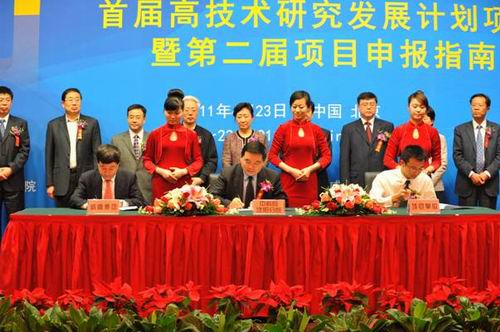 随后,包信和、陈学利与“Ti2448合金在骨科植入器械的应用研究”等8个首批启动项目的承担单位共同签订了项目合同书。首批启动的项目涉及骨科和口腔科植入器械用的钛合金类金属材料、血液输注、储存和净化用的高分子材料、骨科植入体表面涂层用的生物无机材料以及脊髓损伤用康复机器人和肿瘤用药控释制剂等。