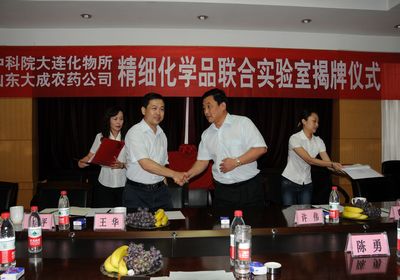 8月18日,“中国科学院大连化学物理研究所—山东大成农药股份有限公司‘精细化学品联合实验室’”签约及揭牌仪式在山东淄博举行。山东大成化工集团有限公司副总经理兼山东大成农药股份有限公司副董事长许伟、山东大成化工集团有限公司副总经理滕军、大连化物所副所长王华、郑卓研究员、胡向平副研究员等出席了仪式。