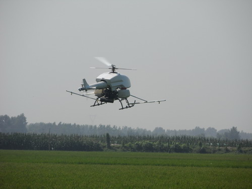 无人直升机是一种无人驾驶的直升机系统,可以通过机上的飞行控制系统自动按照预定的任务进行飞行并返回降落地点。比起其他飞行器,具有垂直起降、定点悬停等特点,特别适合于农业施药这种起降场地受限、超低空飞行类的应用。中科院沈阳自动化所自2003年就开始无人直升机自主控制研究,到现在为止已经研制出可携带10kg、30kg载荷的无人直升机系统,可广泛应用于紧急救援、输电线路的巡检与架设、农业作业、灾情勘测、航空拍摄等。此次试验的是沈阳自动化所研制的30kg载荷无人直升机施药系统,可完成每小时60-100亩的作物喷洒。喷洒时只需输入农田区域信息、风力信息及设定喷洒药量,便可实现喷洒全过程无人员操作、施药量可控喷洒,具有高效、精准、环保、易用等优势。无人直升机系统在农业上有广泛应用领域,在解决劳动力匮乏、减轻劳动强度、减少农药用量、精准作业等方面展示了充分的优势。但由于目标客户匮乏、经验数据不足,迟迟没有实现产业化。