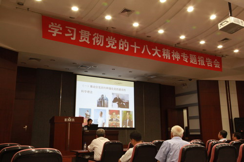 报告会邀请中共辽宁省委党校党建教研部主任储霞教授作题为《全面提高党的建设科学化水平》的专题辅导报告。储霞围绕党的建设科学化提出的价值与意义,全面提高党的建设科学化水平的总体布局与重点工作以及全面提高党的建设科学化水平的条件保障三个方面,对十八大报告提出的全面提高党的建设科学化水平进行了全面解读。特别是对“全面提高党的建设科学化水平”总体布局中的一条主线、两个坚持、五大建设、四个能力和一个目标以及重点工作中的八项任务进行了详细的分析和讲解。