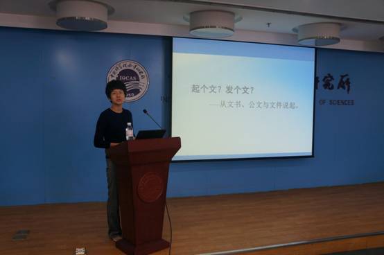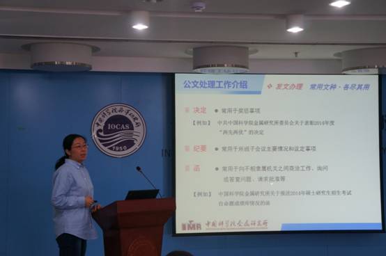 在培训会上,院办公厅文书处刘阳作了“中国科学院公文处理办法解析及实例研讨”专题报告,金属所办公室何孝瑛作了“浅谈金属所公文处理工作”专题报告,大连化物所于沁作了“二期档案进馆工作交流”专题报告。参训人员根据报告内容,紧密结合各自的工作,就公文拟制和修改、公文核稿、公文流转、公文与档案管理的衔接、二期档案进馆工作流程及个人工作中遇到的具体问题和体会,进行了热烈研讨和交流,并结合海洋所二期档案进馆工作,现场对其档案整理工作进行了研讨和交流。