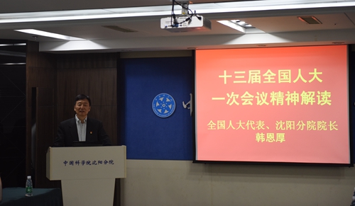 3月26日,沈阳分院传达十三届全国人大一次会议精神暨党课报告会在分院机关召开。十三届全国人大代表、沈阳分院院长韩恩厚传达会议精神。沈阳分院分党组书记、副院长姬兰柱,副院长马越红,分党组副书记、纪检组组长徐岩以及机关全体职工参加了学习会议?;嵋橛缮蜓舴衷悍值匙榘熘魅吻纳鞒?。