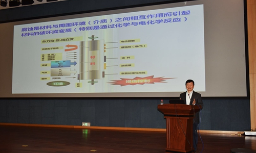 活动中,世界腐蚀组织主席、沈阳分院院长、金属研究所研究员韩恩厚为社会公众做了题为“腐蚀—使用材料的永恒主题”的精彩报告。他从什么是腐蚀、腐蚀给我们日常生活带来的威胁、对国家的重大工程如航天、核电、油气、高铁和桥梁等造成的重要影响,以及如何控制和利用腐蚀等方面进行了全面的介绍。