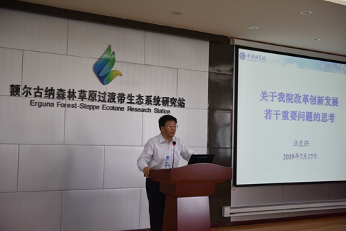 在专题报告???,汪克强作了题为《关于我院改革创新发展若干重要问题的思考》特邀报告。报告从“从历史走向未来”、“新形势新挑战新要求”、“近期重点工作”三个方面,全面历史回顾了新中国科技创新70年发展历程,中科院与祖国同行、与科学共进的光辉历程以及相关启示和问题,对当前我院大力推进“率先行动”计划的战略性安排、加快实现“六个根本性转变”等进行了深入解读,同时阐述了我院近期的工作重点。汪克强强调,党的领导是中科院的根本保障,国家的需求是中科院的存在依据。中科院一直牢记“创新科技、服务国家、造福人民”的宗旨,当前“三个面向、四个率先”办院方针的提出,就是院党组贯彻落实“四个意识”的具体体现。汪克强指出,当前开展的“不忘初心、牢记使命”主题教育,需要我们牢记中科院的办院方针和宗旨,把主题教育的成果转化为创新发展的动力,不断产出改革创新工作成果,向党和国家以及人民交上满意的答卷。随后,汪克强主持召开了工作座谈会,征集了我院以及研究所改革创新发展存在的问题和意见建议,并就战略规划、人才队伍建设、体制机制创新等相关问题开展了热烈的讨论。沈阳生态所所长朱教君作了题为《坚守生态科技创新初心、践行美丽中国建设使命》的专题报告,报告对生态文明建设的重要意义、亟待解决的科学问题、以及森林屏障生态安全带的实践等进行了详尽的阐述,对于我们正确认识“绿水青山就是金山银山”的发展理念,推动形成绿色发展方式和生活方式具有积极意义。