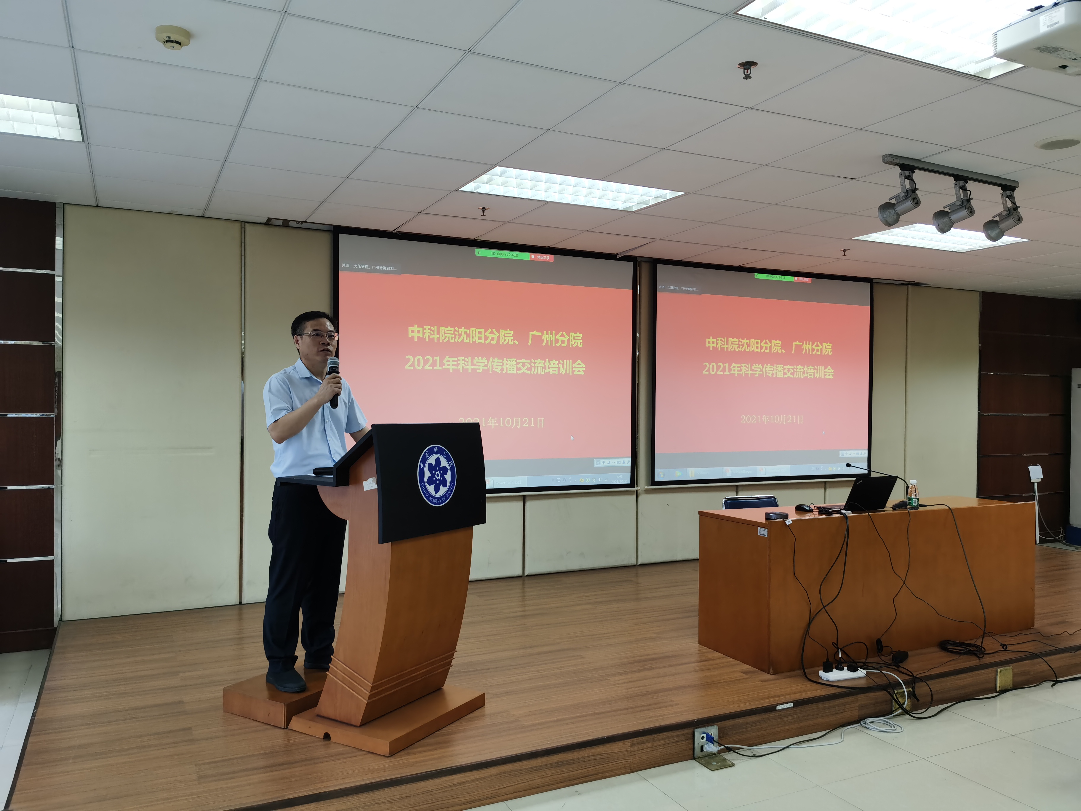 为认真贯彻落实院夏季党组扩大会议关于统筹抓好科学传播和科普工作要求,促进分院之间的学习和交流,加强科学传播队伍建设,提升科学传播工作能力和水平,10月20日至22日,沈阳分院、广州分院联合举办2021年科学传播交流培训会,主会场设在广州,其他地区设视频分会场。沈阳分院副院长马越红,广州分院副院长谢昌龙,广州地化所党委副书记李海滨,华南植物园党委副书记徐海,沈阳分院、广州分院系统各单位科学传播工作部门负责人及业务骨干共62人参会?;嵋榉直鹩晒阒莘衷喊旃腋敝魅卫钕?,沈阳分院办公室副主任刘妍、党群工作处副处长刘旭东及华南植物园综合办副主任黄瑞兰主持。