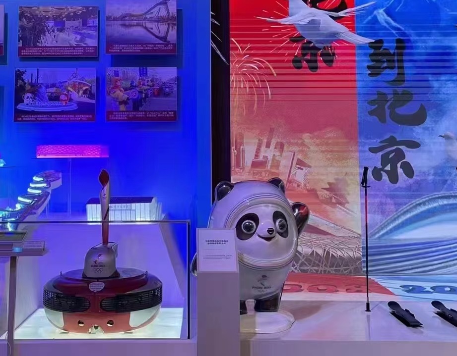 北京冬奥展区——北京冬奥会水下火炬传递机器人(图中,冰墩墩左侧)