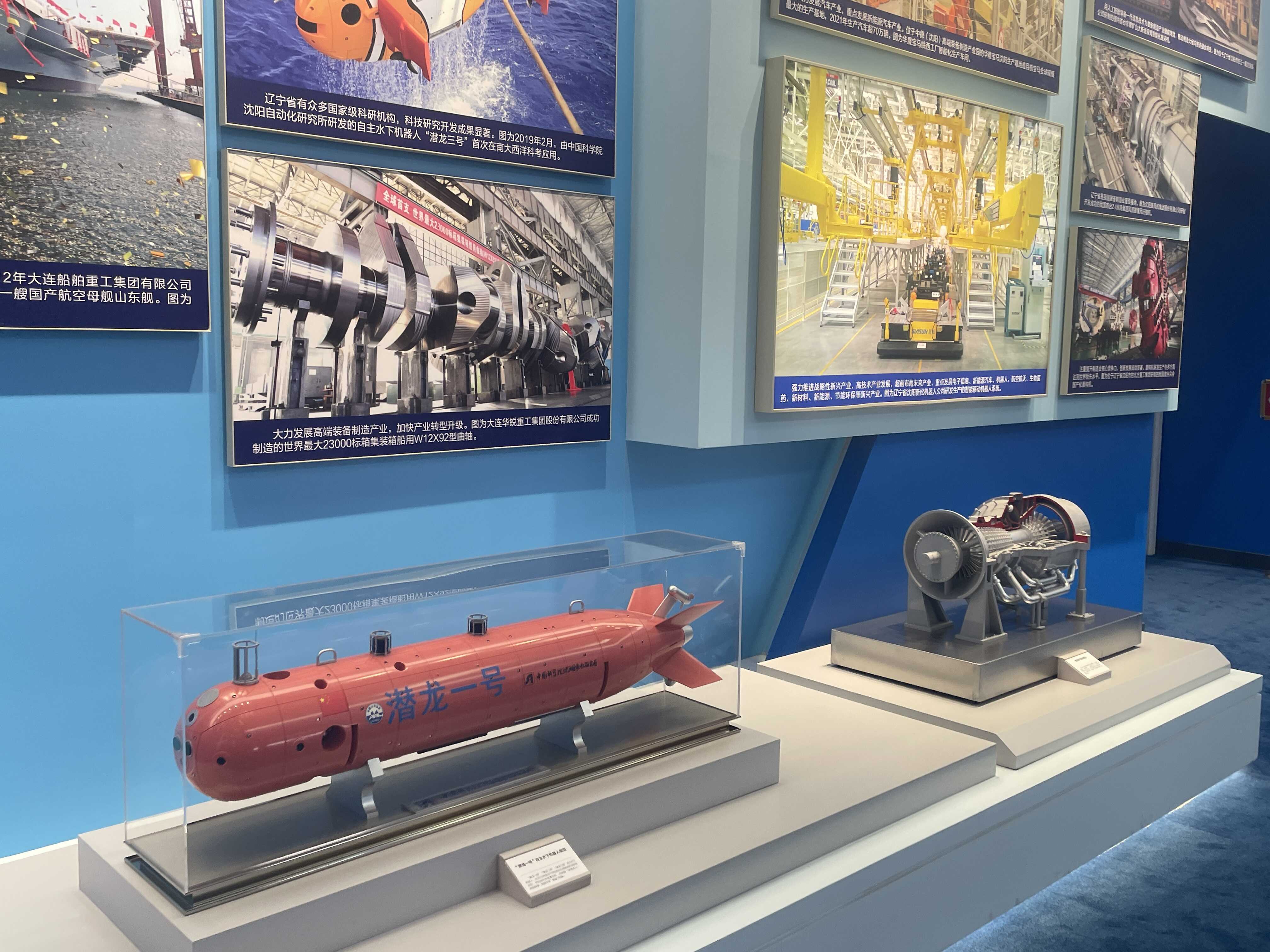 辽宁展区——“潜龙一号”、重型燃气轮机(图左及右)