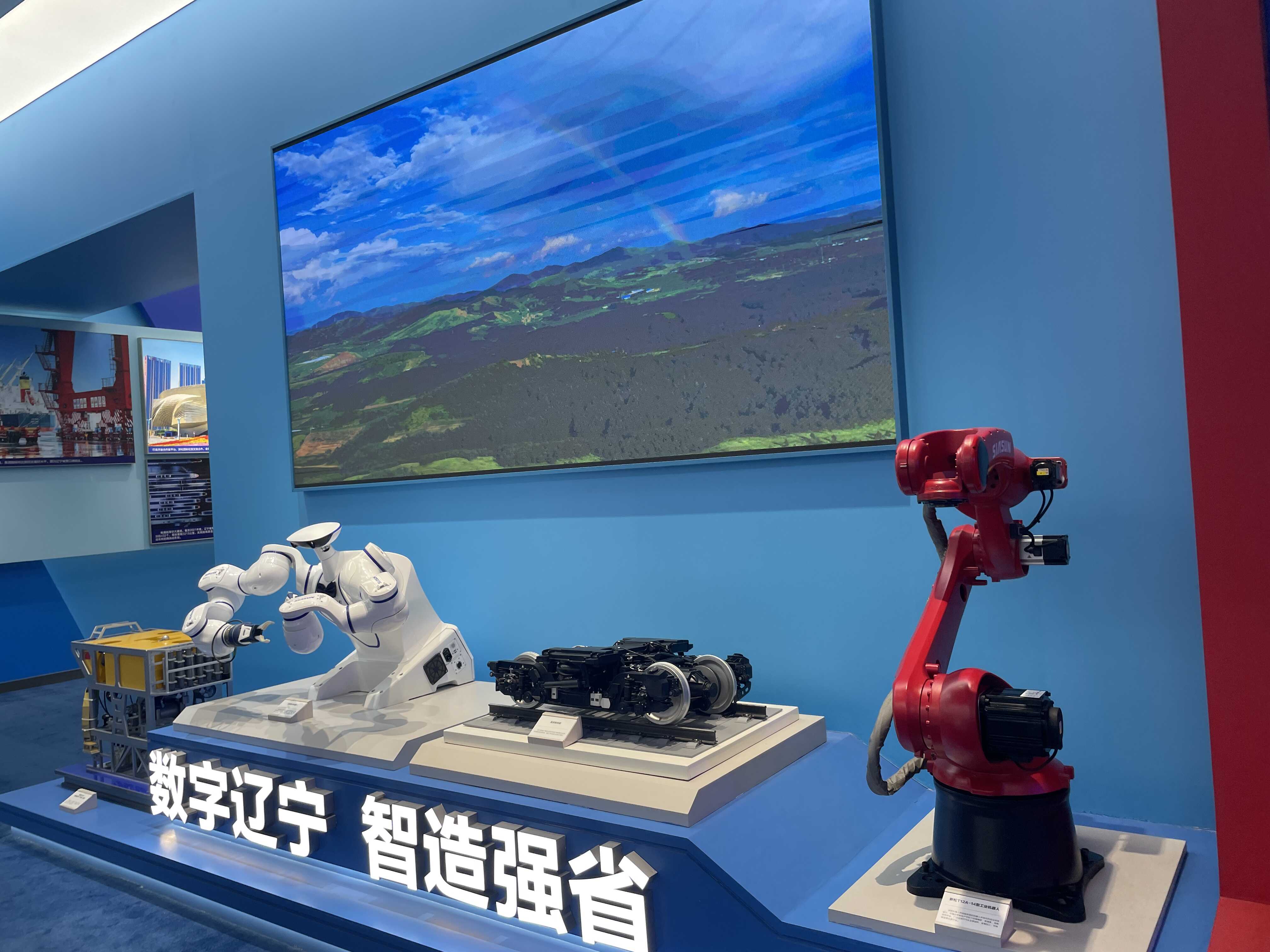 辽宁展区——“海星6000”有缆??厮禄魅恕⑿滤伤坌骰魅?、高铁转向架、新松工业机器人(图左及右)