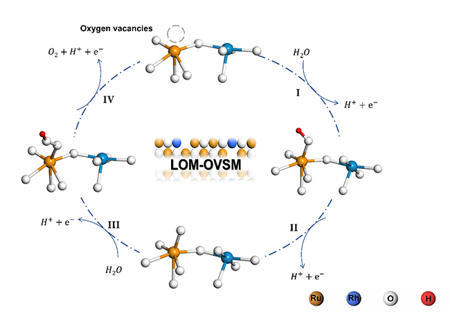 近日,中国科学院大连化学物理研究所催化国家重点实验室二维材料化学与能源应用研究组研究员吴忠帅团队与理论催化创新特区研究组研究员肖建平团队合作,在电催化水氧化催化剂设计和机理解析研究方面取得新进展。合作团队发展了Rh掺杂和RuO2表面氧空位的协同新策略,实现酸性水氧化过程的高效稳定催化转化,并揭示了晶格氧介导—氧空位反应机制(LOM-OVSM)。