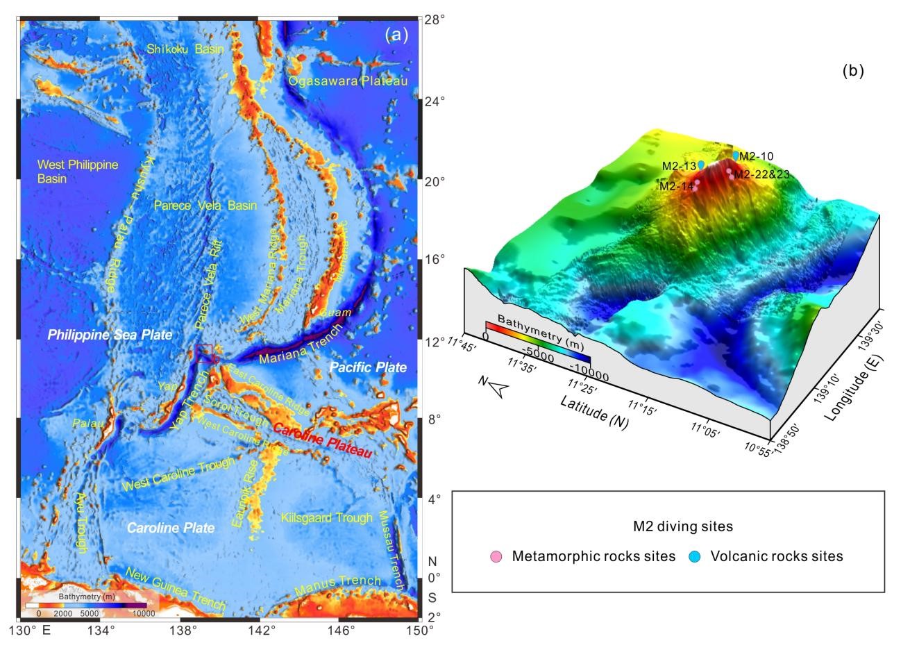 图1 西太平洋海底地形和构造背景示意图(a);马里亚纳俯冲带最南端的弧前区M2站位的火山岩和变质岩样品采样位置图(b)