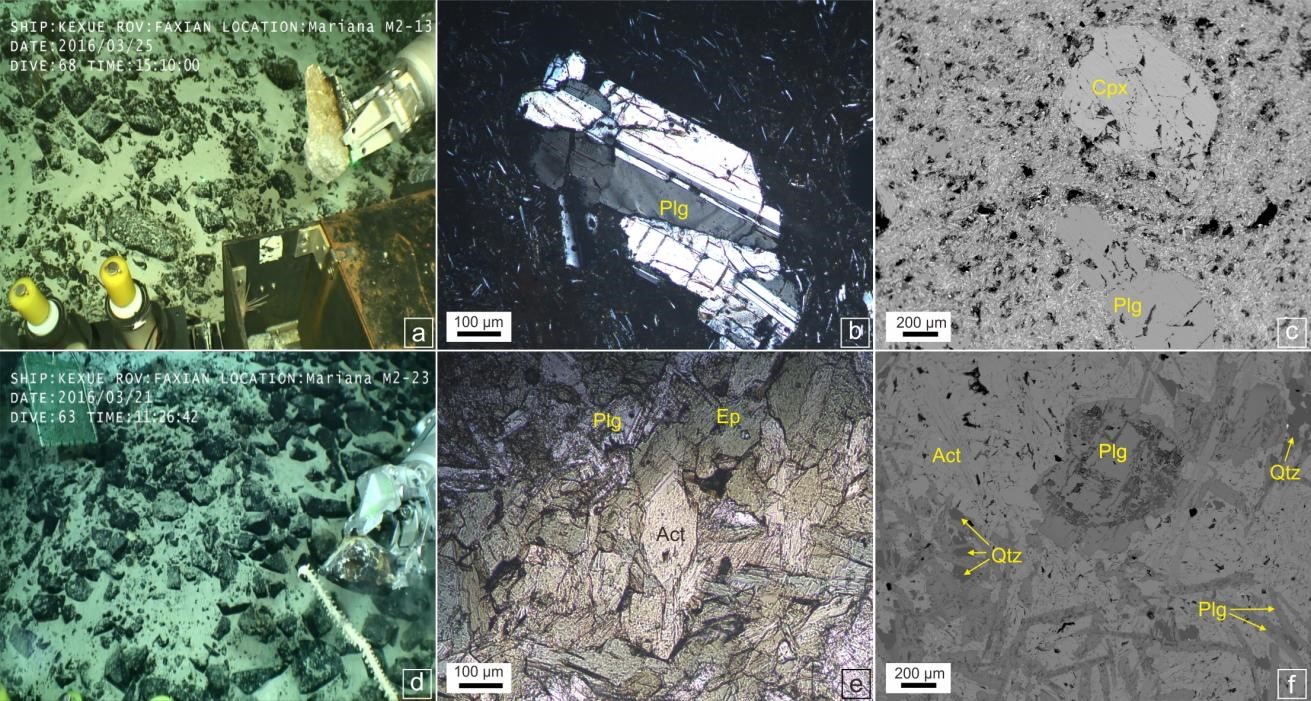 洋底高原随着大洋板块运动至俯冲带时,可能对俯冲带边界形态、岛弧构造演化产生重要影响,并引起大规模变质和岩浆活动。该研究团队通过“发现”号无人缆控潜水器在马里亚纳岛弧最南端的弧前区(图1)获得了火山岩和变质岩样品(图2)。这些火山岩和变质岩是研究洋底高原特殊与俯冲带相互作用机制的理想对象,可能记录了卡洛琳洋底高原与西南马里亚纳岛弧的形变和演化历史。