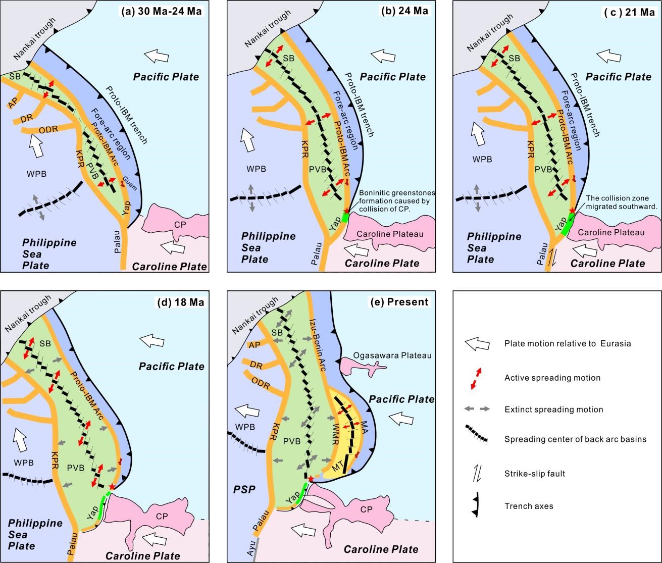 图5 西南马里亚纳俯冲带的构造演化模型:碰撞前阶段(a)、碰撞阶段(b-c)和碰撞后阶段(d-e)