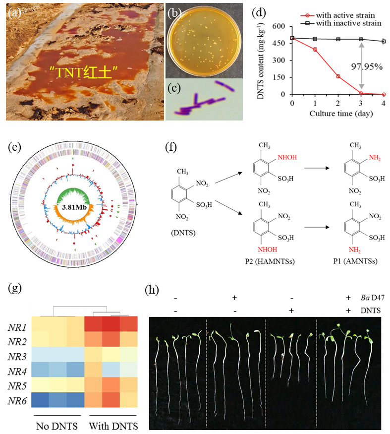 “TNT红土”是受TNT炸药精制过程中的“TNT红水”污染的土壤,其主要成分是二硝基甲苯磺酸盐(DNTS)。DNTS具有“致癌、致畸、致突变”的特性,对生物体和环境具有极大的破坏性。传统的理化修复技术成本高且易造成二次污染,因此亟需发展安全、绿色的生物治理方法。近日,青岛能源所付春祥带领的能源作物分子育种研究组从“TNT红土”中分离获得了一株新的能够高效降解DNTS的微生物菌株。通过表型与分子特征鉴定确定该菌株为高地芽孢杆菌,命名为Bacillus altitudinis D47,该菌株能够在3天内将DNTS(500 mg/kg)降解约98%,代谢特征分析表明其代谢DNTS的生物学机制为硝基还原作用,进一步利用紫花苜蓿的生长胁迫试验验证了B. altitudinis D47具有显著减轻DNTS毒性的功能。该成果发表于环境科学与生态学一区SCI期刊Journal of Cleaner Production,题为“Screening of Bacillus altitudinis D47 from TNT red water-contaminated soil for highly dinitrotoluene sulfonate efficient biodegradation”。