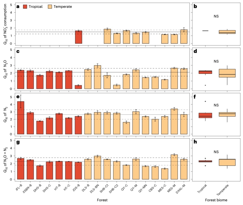 这项研究成果以“Universal temperature sensitivity of denitrification nitrogen losses in forest soils”为题于2023年6月22日发表在Nature Climate Change上(IF2021=28.66)。中国科学院沈阳应用生态研究所于浩明博士生为第一作者,方运霆研究员和中国科学院地理科学与资源研究所张扬建研究员为共同通讯作者。合作者还有挪威生命科学大学Jan Mulder教授和Peter Dorsch教授、美国纽约州立大学朱伟兴教授、中国科学院青藏高原研究所旭日研究员等。该研究受到国家重点研发计划(2016YFA0600802)和中国科学院卢嘉锡国际团队项目(GJTD-2018-07)等项目资助。