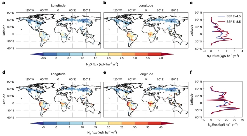 a-c和d-f图分别为SSP2-4.5和SSP5-8.5情景模式下的气态氮释放模拟结果